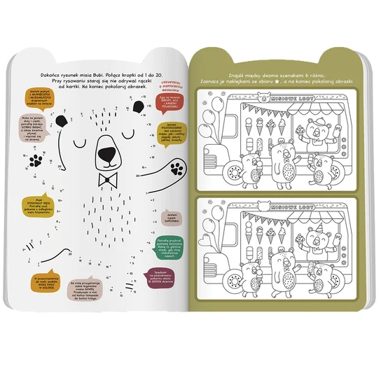 Pozwala dziecku rysować, kolorować, wyklejać oraz uczyć się kształtów poprzez zabawę.