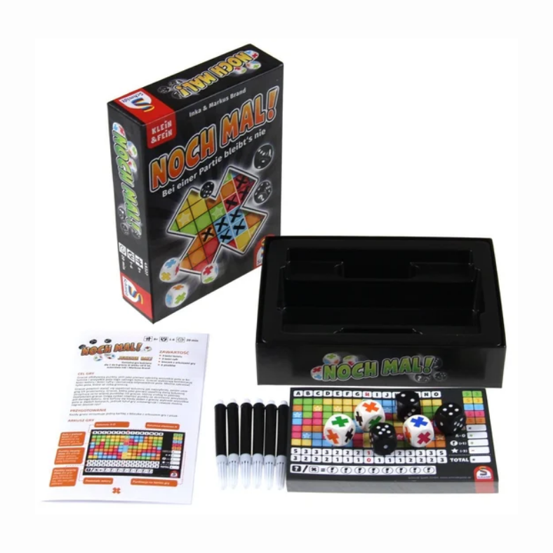 Noch mal! to lekka, przyjazna gra kościana z serii roll & write, w której gracze wspólnie rzucają kośćmi, a następnie wykorzystują wyniki do planowania i zaznaczania pól na własnych arkuszach planszy, tak aby zdobyć jak najwięcej punktów we wspólnej rywalizacji.