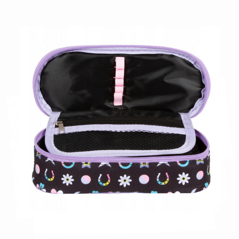 Dodatkowo piórnik posiada drugą klapkę z gumką mieszczącą 4 przybory oraz kieszonkę z siateczki zapinaną na zamek.