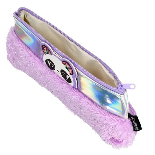 Wykonany z pluszowego materiału w fioletowo-holograficznej kolorystyce z grafiką Pandy, przyciąga uwagę i wyróżnia się nowoczesnym wyglądem.
