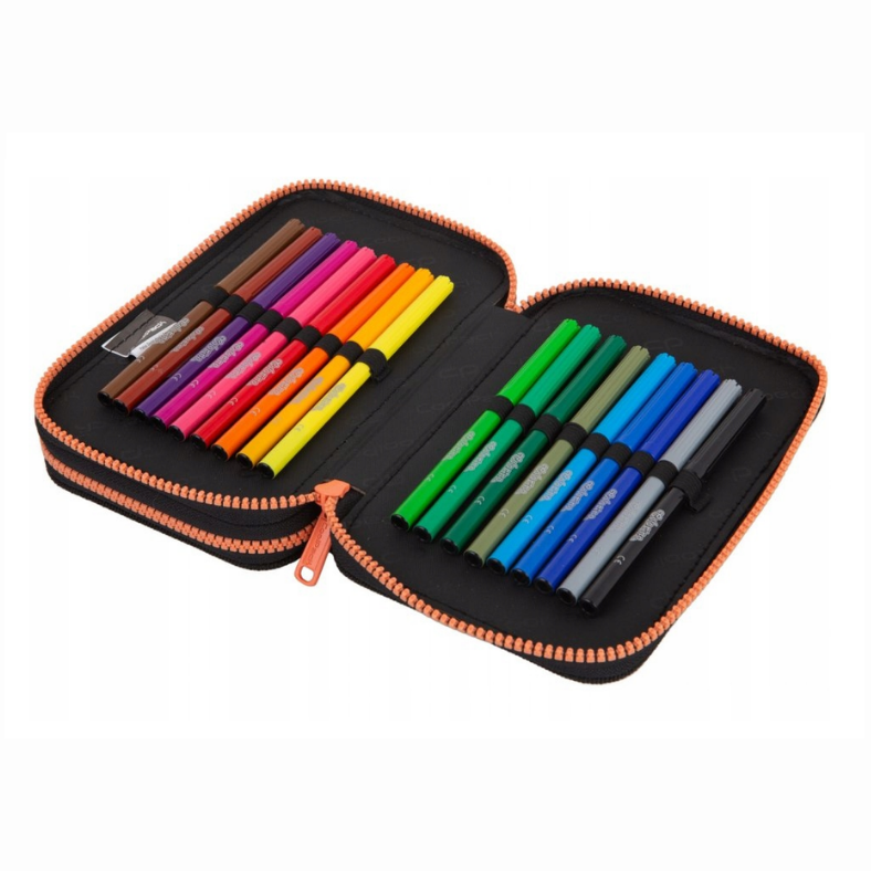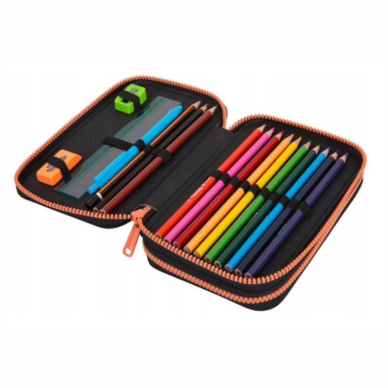 W zestawie znajdują się oryginalne kredki, mazaki, ołówek oraz inne przybory marki Colorino, dzięki czemu piórnik jest w pełni wyposażony.