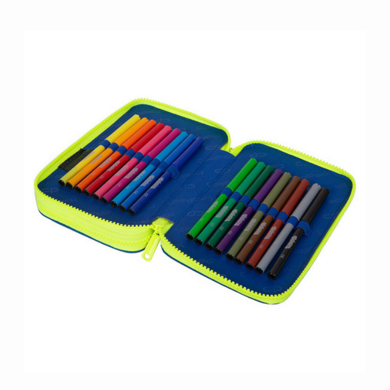 W zestawie znajdują się oryginalne kredki, mazaki, ołówek oraz inne przybory marki Colorino, dzięki czemu piórnik jest w pełni wyposażony.