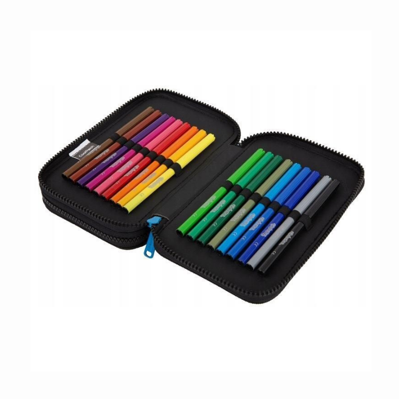 W zestawie znajdują się oryginalne kredki, mazaki, ołówek oraz inne przybory marki Colorino, dzięki czemu piórnik jest w pełni wyposażony.