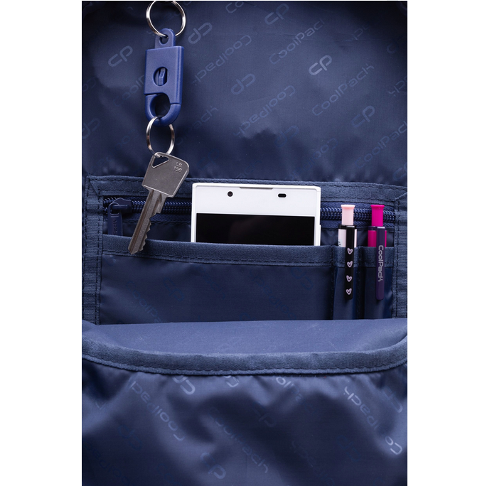 Dodatkowa kieszeń pomaga utrzymać porządek w drobnych przyborach, a przednia kieszeń i boczne uchwyty na bidon lub parasolkę zwiększają funkcjonalność plecaka w codziennym użytkowaniu.
