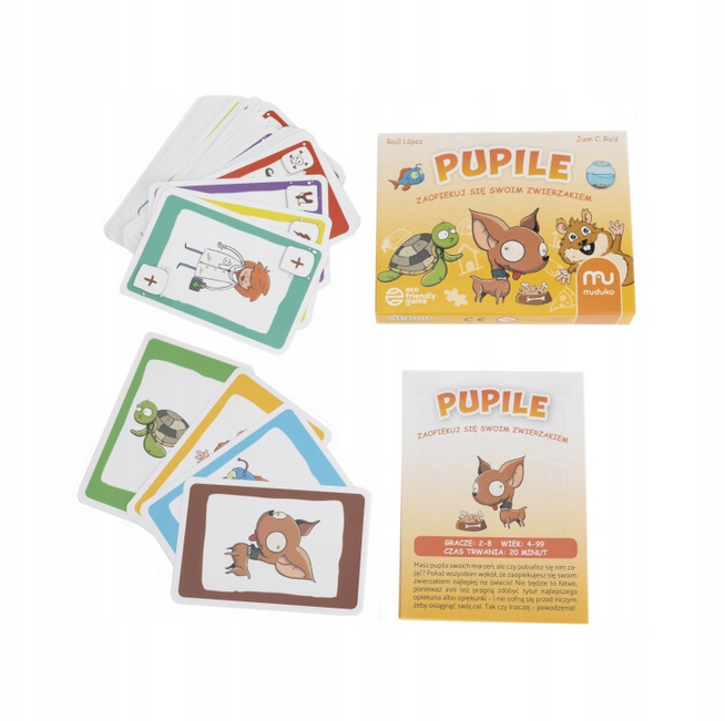 „Pupile. Zaopiekuj się swoim zwierzakiem” to prosta gra karciana, w której gracze wcielają się w opiekunów wymarzonego zwierzątka. Celem rozgrywki jest zaspokojenie wszystkich czterech potrzeb pupila poprzez zagrywanie kart potrzeb, stanów oraz akcji. Uczestnicy muszą nie tylko dbać o swoje zwierzątko, ale również reagować na działania innych graczy, którzy mogą utrudniać im zwycięstwo. Wygrywa osoba, której pupil jako pierwszy będzie zdrowy, zadowolony i będzie miał spełnione wszystkie potrzeby. Gra porusza temat odpowiedzialności za zwierzęta domowe, rozwija empatię oraz wprowadza najmłodszych w świat gier karcianych.