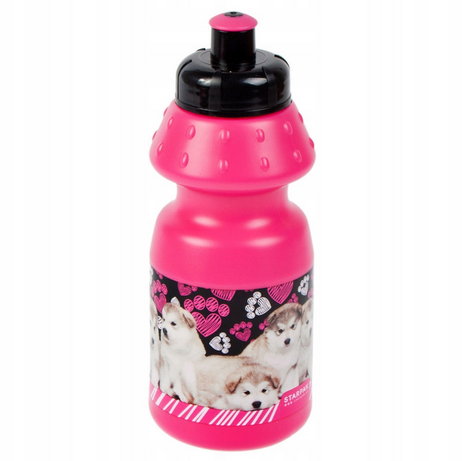 Zawiera bidon o pojemności 350 ml z dzióbkiem i wygodnym guziczkiem, który ułatwia otwieranie, zamykanie oraz picie napojów. Bidon został ozdobiony kolorową grafiką w pieski, co przyciąga uwagę najmłodszych.