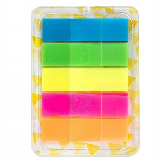 Zestaw zawiera zakładki w pięciu intensywnych, neonowych kolorach, zamknięte w wygodnym blistrze z podajnikiem.